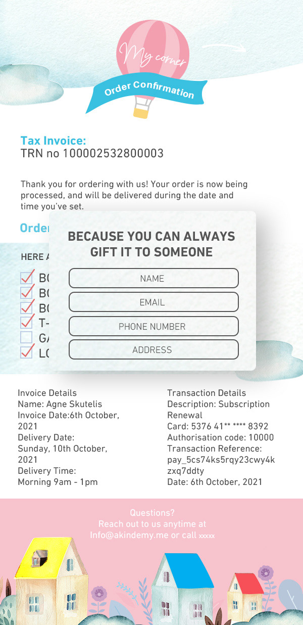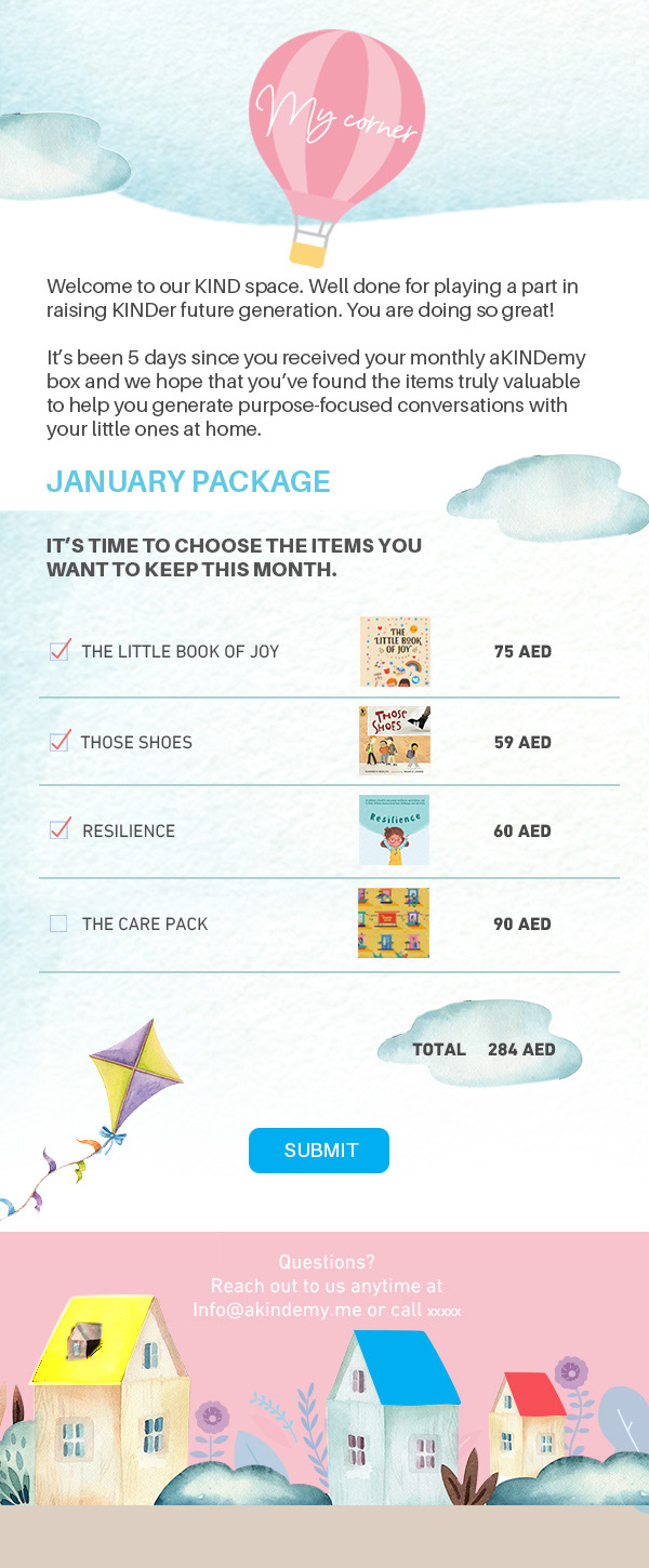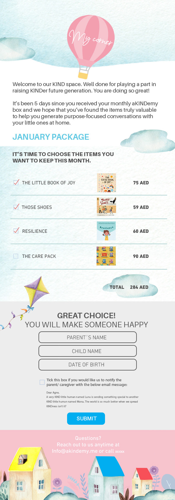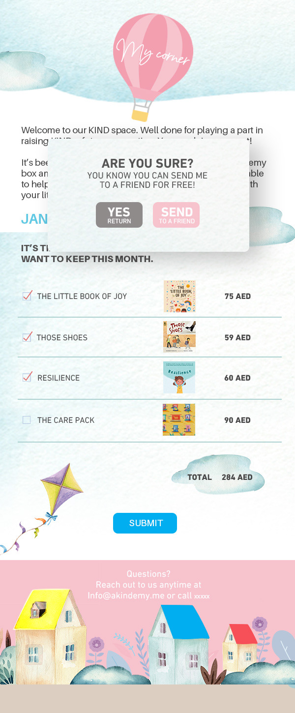 It's a subscription-based product for kids, kids can decide what to keep from the box and they can send what's left to someone else for free.